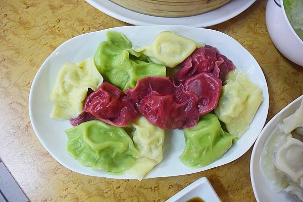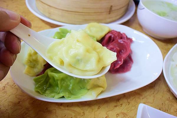 也就是俗稱的三色水餃,分別用紅麴、南瓜和波菜擀製成紅、黃、綠色的水餃皮,一端上來就讓人驚豔。
