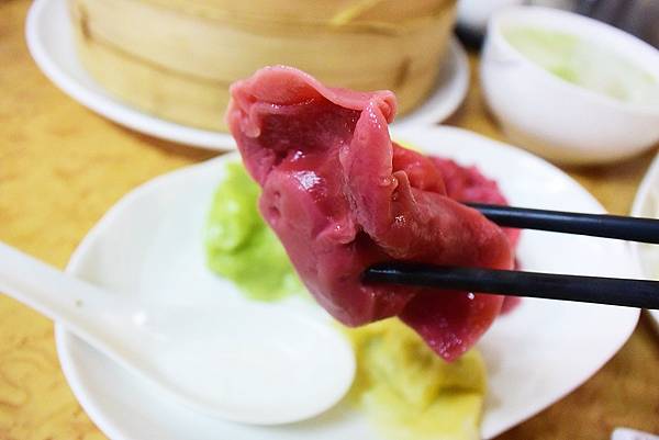 紅寶高麗菜水餃的皮是加了紅麴做的,顏色鮮豔得真像顆紅寶石。