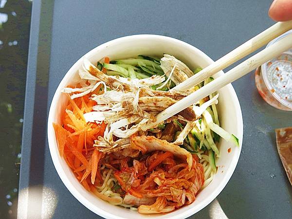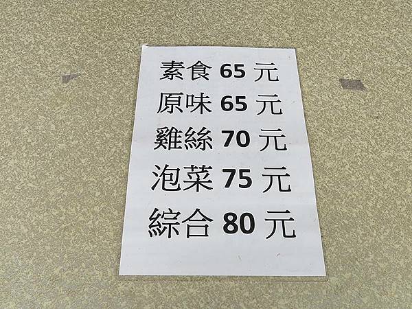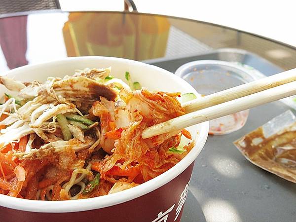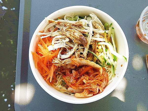 小桌上貼了一張涼麵的各種口味和價目,原味就是沒有雞絲和泡菜,只有小黃瓜絲、蘿蔔絲和蒜泥、辣椒、芝麻三種醬;素食沒有蒜泥包,其他各有雞絲口味和泡菜口味,綜合就是雞絲和泡菜都有。