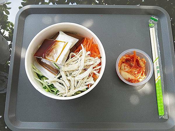 雞絲、泡菜、小黃瓜絲、蘿蔔絲和3包醬料包。