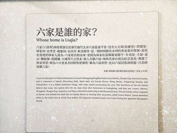 至於六家地名的由來,有一說是原稱六屋,取自林家在廣東饒平有老屋、斗屋、東山、騰蚊嶺、胡揚樓和大埔等六大世系,故稱為六屋,日治時期改六家。